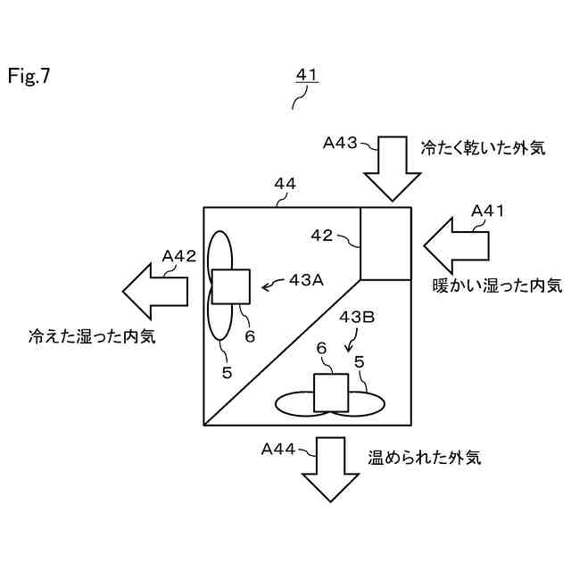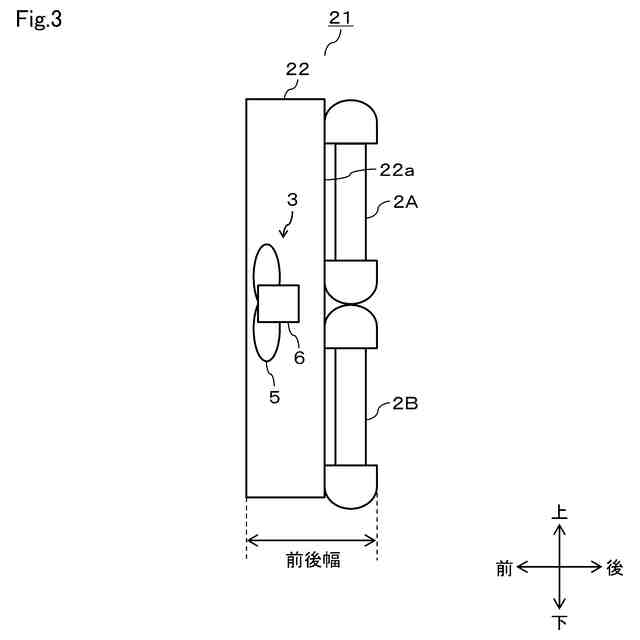 従来技術の熱交換装置101は、例えば施設園芸や畜産用といった農事用の空調として用いることができるが、このような用途においては熱交換装置101を畝の間などの通路部に設置することになる。このような設置を考えた場合、従来技術の構成のように前後方向の寸法である前後幅が比較的長いと、通路を塞いでしまうことになり、そうすると作業性が悪化するため、これを防止するために畝間を広げる必要が生じる。しかし、畝間を広げると、施設園芸では農作物を植えるスペース、つまり栽培面積が狭くなり、また、畜産用では畜舎が狭くなり、その結果、収穫量などが低下するおそれがある。