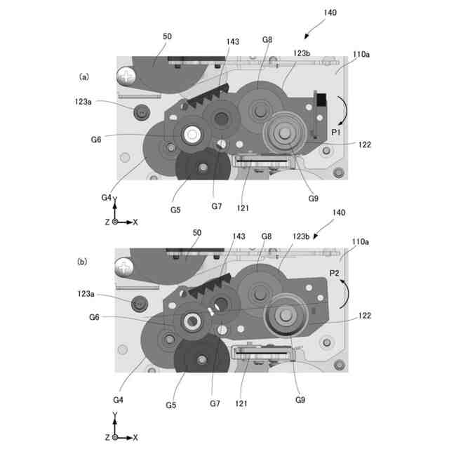 (a)は、固定機構による歯車列の固定が解除された状態を示す模式図であり、(b)は、固定機構によって歯車列が固定された状態を示す模式図。