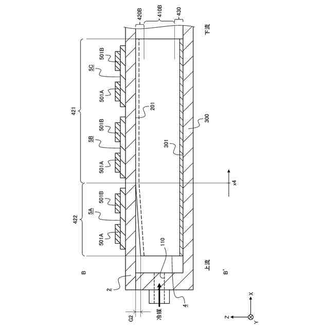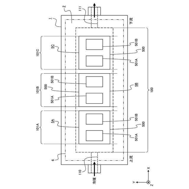 本明細書では、Z方向を上下方向と称することがある。本明細書において、「上」や「上方」は、基準となる面、部材、位置等よりもZ方向正側であることを意図し、「下」や「下方」は、基準となる面、部材、位置等よりもZ方向負側であることを意図する。例えば、「部材Aの上に部材Bが配置される」と記載されるとき、部材Bは、部材AからみてZ方向正側に配置される。また、「部材Aの上面」と記載されるとき、その面は、部材AにおけるZ方向正側の端に位置し、Z方向正側を向いた面である。これらの方向や面は、説明の便宜上用いる文言であり、冷却器の取付姿勢等によっては、X軸、Y軸、及びZ軸の方向のそれぞれとの対応関係が変わることがある。例えば、冷却器における配線板及び半導体素子が配置される面は、本明細書では冷却器の上面と呼ぶが、これに限らず、冷却器の下面、側面等と呼ばれてもよい。また、印刷紙面の図が実際の物を反時計方向に90度回転させた図(例えば図5等)であるときの上下方向及び左右方向は、印刷紙面における上下方向及び左右方向を半時計方向に90度回転させた方向とする。例えば、図5における「図の左側」及び「図の右側」は、それぞれ、印刷紙面における「図の下側」及び「図の上側」を指す。