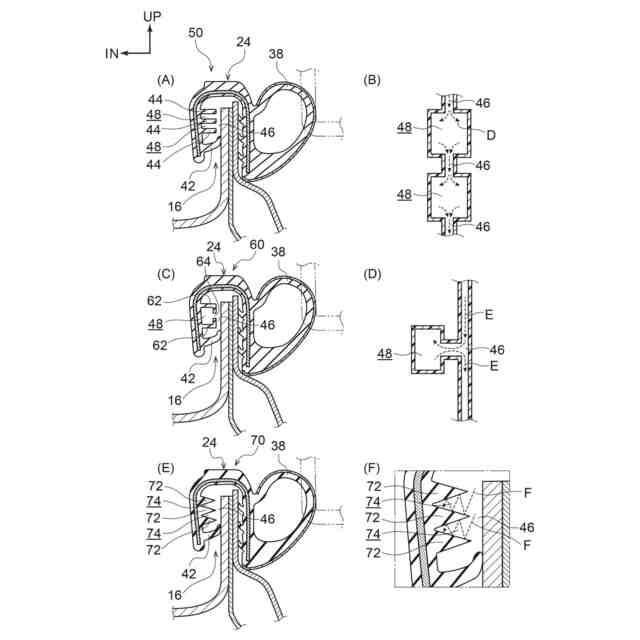 【解決手段】ウェザストリップ10は、車体側部12に設けられた車体ドア開口部14の周縁部に配置されたフランジ部16に取付けられる断面略U字型の取付基部24と、取付基部24における車外側側壁部28の車室外側に一体に設けられ、ドア閉止時に弾性変形してフランジ部16とドア本体との間をシールするシール部38と、取付基部24における車内側側壁部30の端部に設けられ、車外側側壁部28との間にフランジ部16を弾性的に把持する抜止め用のリップ部42と、車内側側壁部30において車外側側壁部28と対向する位置でかつリップ部42より取付基部24の底壁部26側に形成され、フランジ部16側へ突出されると共に先端部とフランジ部16との間に隙間46が設けられた複数の突出部44と、を有する。