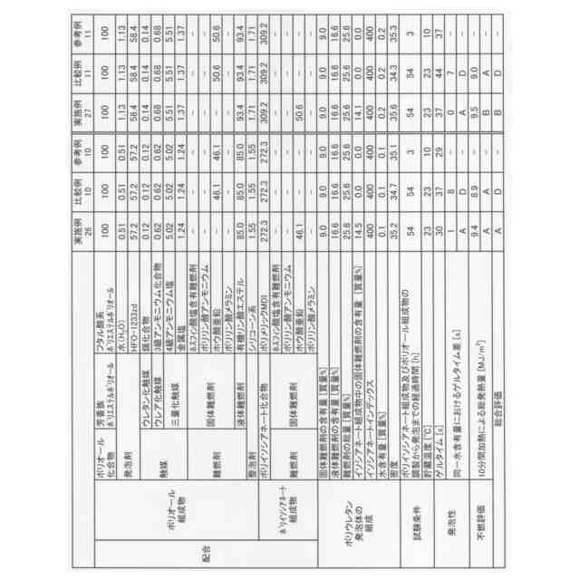 また、国際公開第2020/110332号(特許文献2)には、ポリオールを含む組成物Aとポリイソシアネートを含む組成物Bとから構成され、かかるポリオールとポリイソシアネートとの反応と、発泡剤による発泡とにより、ポリウレタンフォームが形成される発泡性組成物であって、前記組成物Aに、触媒として、少なくとも三量化触媒が含まれるとともに、有機ホスフィン酸金属塩が、前記ポリオールの50質量部に対して30質量部以上の割合で、前記組成物A及び前記組成物Bの少なくとも何れか一方に含まれる、不燃性ポリウレタンフォーム用発泡性組成物が記載されている。