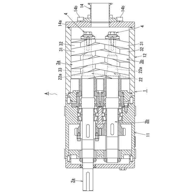 そして、2つのスクリュー200a,200bは、回転軸100a、100bに設けられたスクリュー嵌合軸部110が、スクリュー200a,200bに穿設された軸嵌合孔部230に嵌合し、図示していないキーによりスクリュー200a,200bの軸まわりの位置決めをした状態で回転軸100a、100bの先端に設けられた抜け止めボルト用雌ねじ孔130にスクリュー200a,200bの開放端側から抜け止めボルト(固定ボルト)400を螺合させることによって、回転軸100a、100bに抜け止め状態となり、回転軸100a、100bの回転に伴ってケーシング300内で回転するようになっている。