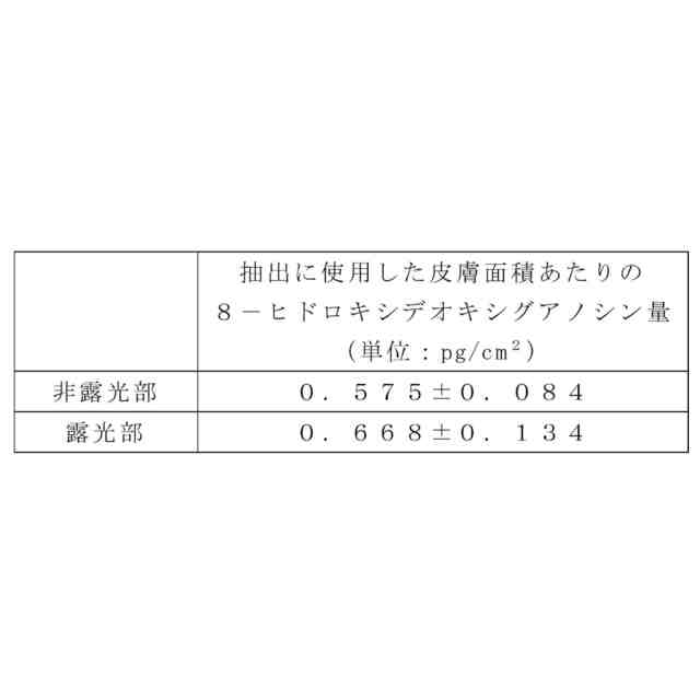8-ヒドロキシデオキシグアノシン(8-hydroxy-2’-deoxyguanosine)は、活性酸素種によるDNAの酸化的損傷によりDNAを構成するデオキシグアノシンの8位がヒドロキシル化された構造を持つ物質であり、DNAの酸化損傷マーカーとして知られている(非特許文献2)。生成した8-ヒドロキシデオキシグアノシンは遺伝子修復酵素の働きで、DNAから切り出され、細胞外に排出され、大部分が尿として生体外へ排出される。8-ヒドロキシデオキシグアノシンは、これまで、尿、血清、末梢白血球を対象に測定され、酸化ストレスの評価に用いられてきた。それらの測定値は、運動、食事などの生活習慣やストレス、疾患などの影響により変動することが知られている。一方、皮膚においては、紫外線や化学物質などの外部刺激による影響が強く現れると予想され、身体の内部における酸化ストレスの評価に用いられている尿、血清、抹消白血球における測定値とは異なると考えられる。皮膚中の8-ヒドロキシデオキシグアノシン量については、非侵襲的な測定が望まれるものの、遊離の8-ヒドロキシデオキシグアノシンは皮膚中に極めて微量しか存在せず、測定は困難と考えられ、非侵襲的に皮膚中の8-ヒドロキシデオキシグアノシン量を測定した報告はない。外科的に摘出された摘出皮膚に対しては、抗8-ヒドロキシデオキシグアノシン抗体を用いて染色する方法が報告されている(非特許文献3)。