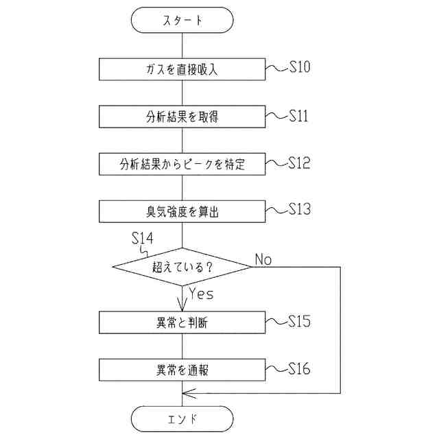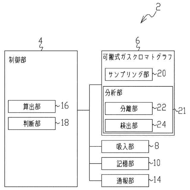 【解決手段】可搬式ガスクロマトグラフ6と、臭気確認対象エリア内のガスに含まれる成分の可搬式ガスクロマトグラフにおけるリテンションタイム、ピークの信号強度及び成分の人が感じる臭気強度を対応させた対応表を記憶する記憶部10を備える。エリア内に配置された可搬式ガスクロマトグラフによる分析結果から、成分のクロマトグラムにおけるピークを特定し、特定されたピークの信号強度及び記憶部に記憶されている対応表から成分の臭気強度を算出する算出部16と、臭気強度が予め設定された臭気強度を超えている場合、エリア内において異常があると判断する判断部18と、判断部において異常があると判断された場合、異常を通報する通報部14から構成される。