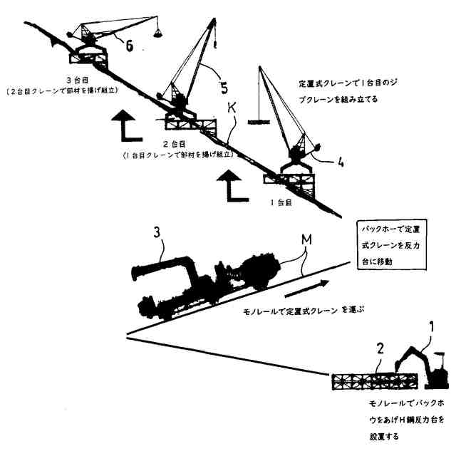 前記課題を解決するため、本発明の傾斜地における工事の施工方法は、傾斜地にモノレールを設置し、該モノレールでバックホウを運んで反力台を設置し、つぎにモノレールで定置式クレーンを運んで前記反力台上に移動させ、該定置式クレーンを使用して1台目のジブクレーンを組み立て、該1台目のクレーンを使用してその上方に2台目のジブクレーンを組み立て、以下繰り返して、傾斜地の上方にジブクレーンを組み立てると共に、該ジブクレーンを使用して資材等の荷揚げ及び/又は荷降ろしを行うことを特徴とする(請求項1)。