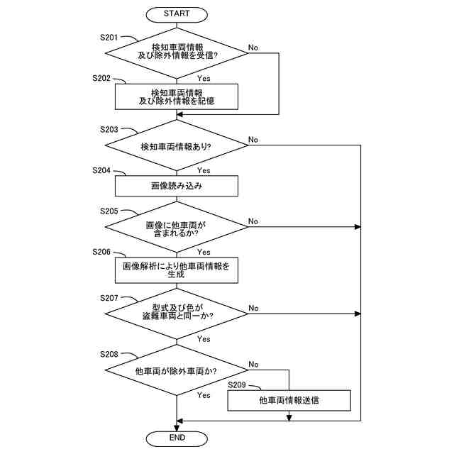 各車両に取り付けられたカメラで撮影した画像に基づいて、盗難車両を検知することが考えられる。自車両の周囲の他車両をカメラで撮影し、この画像を解析してナンバープレートに記載されているナンバー(以下、車両ナンバーともいう。)、車両型式、及び色などに関する情報をサーバに送信することが考えられる。この場合、サーバにおいて、各車両から取得した車両ナンバー、車両型式、及び色などを、盗難車両の車両ナンバー、車両型式、及び色などと比較して、盗難車両であるか否か判定できる。しかし、盗難車両では、不正なナンバープレートが付けられている場合もある。この場合、サーバが、車両型式とナンバープレートとが整合しているか否かを判定することが考えられる。しかし、自車両の周囲の全ての他車両について例えば車両ナンバー、車両型式、及び色などの情報をサーバに送信すると、通信量が膨大になり得る。本開示はかかる問題を解決する。