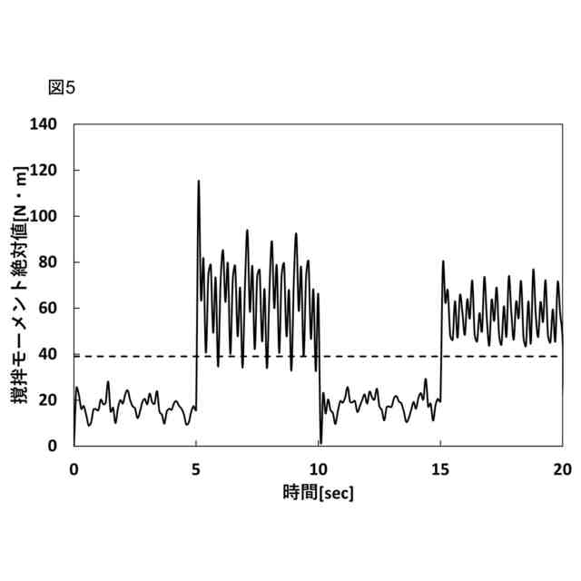 回転速度を切り替えてモータ30を駆動させたときの、2種の材料の混合のシミュレーション結果の他の例を示す図であり、本図は、撹拌モーメントの時間的変化を示す。