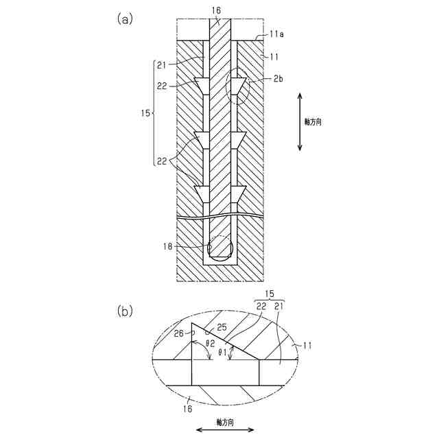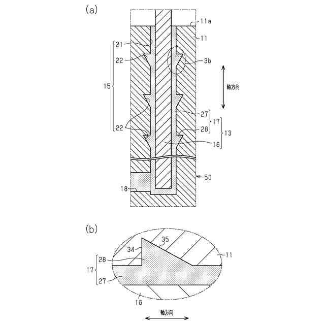 図3(a)は軸方向に沿う軸断面において充填材が形成された状態を示す図であり、図3(b)は3b線で囲まれた部分の拡大図である。