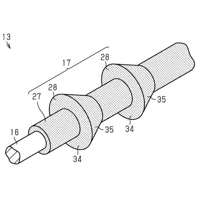 前記内包部から外方に向かって延びる拡幅面と、前記軸芯材を押し込む押込方向側へ前記拡幅面の外周端から延びて、前記軸方向の軸断面において前記内包部に向かう縮径面と、を有して、前記軸方向に間隔を空けて複数形成されている