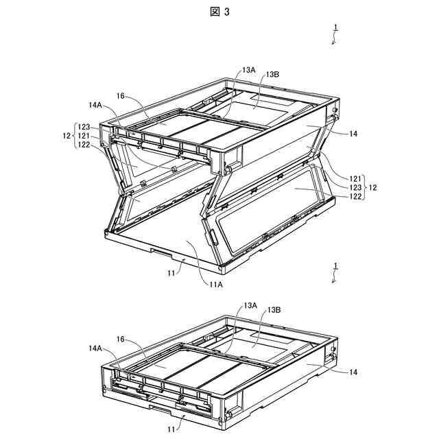 図1に示すように、容器1は、上面が開口した直方体形状であるとともに、図3に示すように折り畳み可能である。折り畳み可能な容器1は、例えばポリプロピレンからなる樹脂製である。