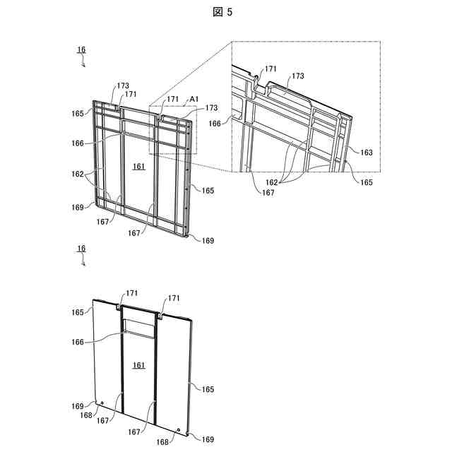 側方開口部を有する第2側壁部から取り外された扉部材を外側から見た斜視図と、その斜視図のA1部分を拡大した部分拡大斜視図と、扉部材を内側から見た斜視図である。