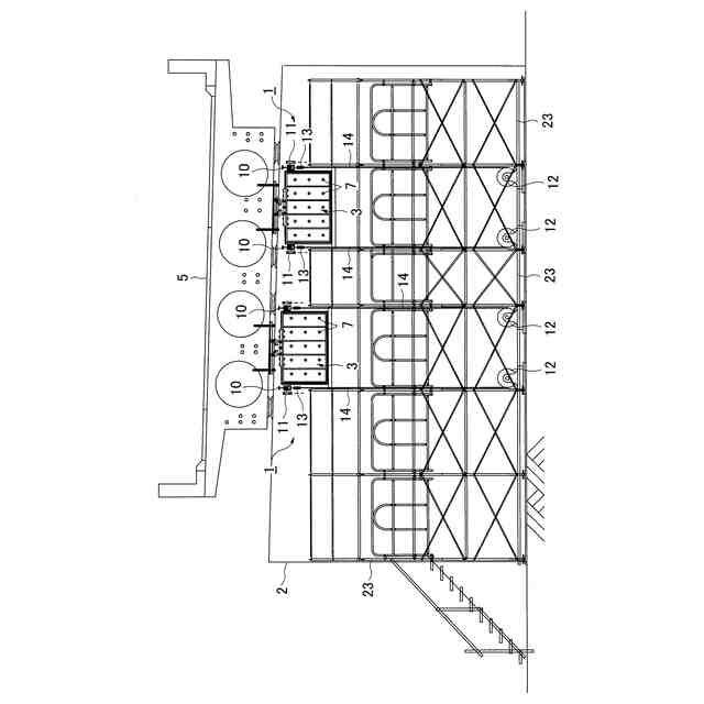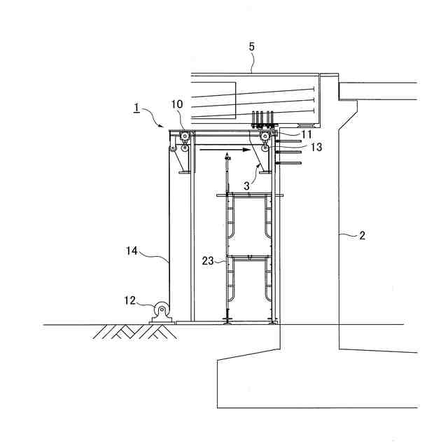 【解決手段】鋼製ブラケット取付位置に向けて水平方向に延びる梁鋼材10と、梁鋼材10に沿って走行可能な移動手段11と、移動手段11を介して鋼製ブラケット3を地上から鉛直方向に揚重する揚重手段12とからなり、揚重手段12によって鋼製ブラケット3を揚重した状態で、移動手段11を梁鋼材10に沿って走行させることで、鋼製ブラケット3を取付位置に移動する。梁鋼材10は、鋼製ブラケット3設置のための足場23の外側から、鋼製ブラケット取付位置に向けて水平方向に延びている。梁鋼材10が鋼製ブラケット3の両側にそれぞれ1本ずつ互いに平行して設けられるとともに、各梁鋼材に移動手段11及び揚重手段12が設けられ、鋼製ブラケット3の両側で揚重手段12によって鋼製ブラケット3が揚重される。