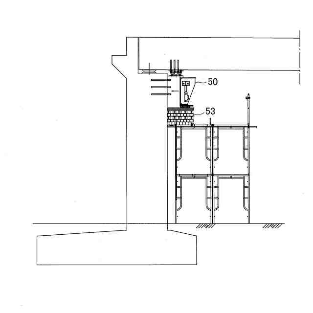 具体的な従来の取付方法について説明すると、図6に示されるように、トラッククレーンなどの揚重装置51によって足場上に鋼製ブラケット50を搬入した後、図7に示されるように、低床台車52などによって足場上を設置位置近傍まで水平移動し、図8に示されるように、桁下面に固定したチェーンブロックやウインチ、ジャッキなどの小型の揚重装置を用いて高さ調整した受け架台53に受け替えた後、所定の固定位置にセットし、固定するという手順で行われていた。