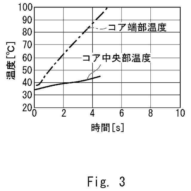 関連する固定子の加熱装置によるコア部の温度上昇を示すグラフである。