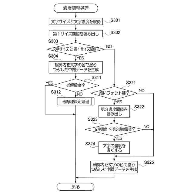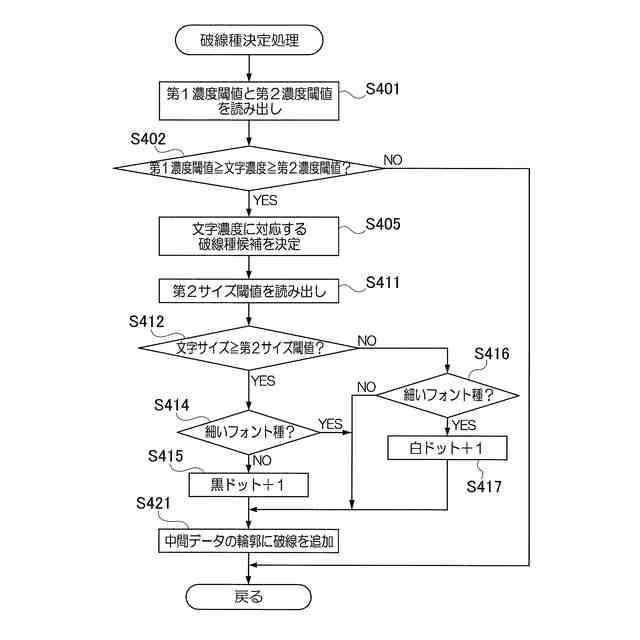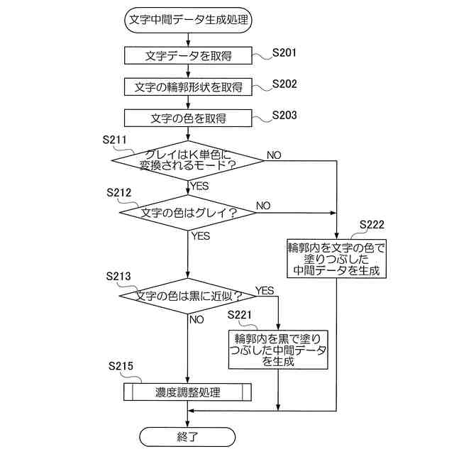 文字の色がグレイでない、または文字の色がグレイでも黒に近似している、または複数の着色剤で印刷する場合、前記破線追加処理を実行しない、