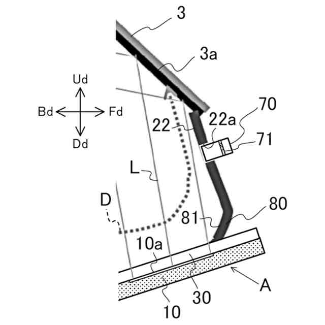 本実施形態に係る車載表示装置100は、図1に示すように、車両1のダッシュボード2(インストルメントパネルを含む)に設けられ、車両1のフロントガラス3(ウインドシールド)の下端領域に設けられたセラミック形成部3aに向けて画像を表す光(以下、表示光L)を発する。