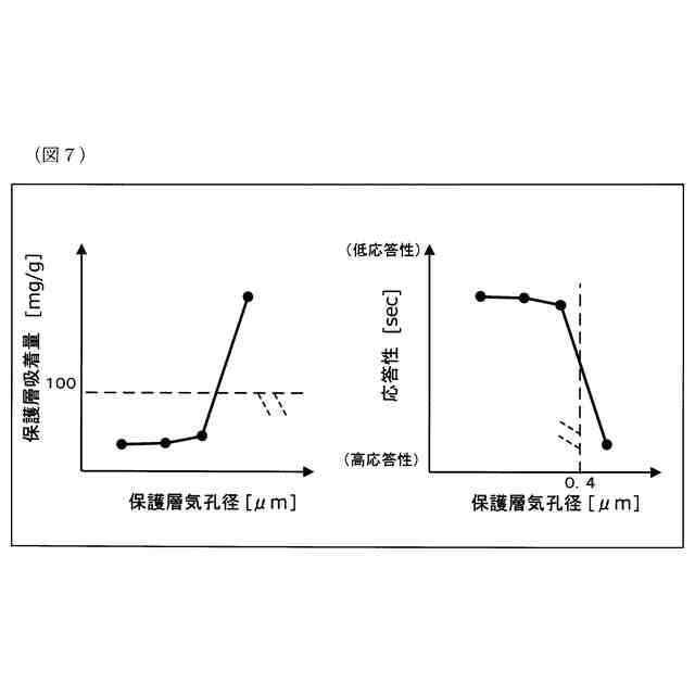 これに対して、多孔質保護層に捕捉される有機成分が、センサ出力の応答性に影響する。すなわち、ガスセンサ素子が使用環境となる雰囲気下において、多孔質保護層に吸着される有機成分が、100mg/g以上であり400mg/g以下のときに、センサ出力の応答性が向上可能であることが判明した。その理由は、必ずしも明らかではないが、多孔質保護層に所定量以上の有機成分が存在することにより、被測定ガスに含まれる酸素との反応が促進され、多孔質保護層を通過する間に消費される酸素が増加する。また、有機成分の吸着量が所定量以下であることにより、被測定ガス室へ至る流路の拡散抵抗の上昇が抑制される。