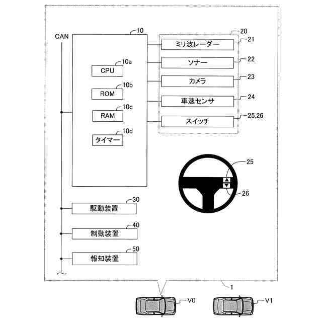 自車両(V0)の挙動(sp0)に関する情報、及び、自車両の直前を走行している先行車両(V1)の挙動(sp1、D)に関する情報を取得するための車載センサ(20)と、