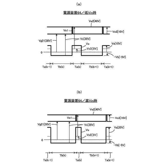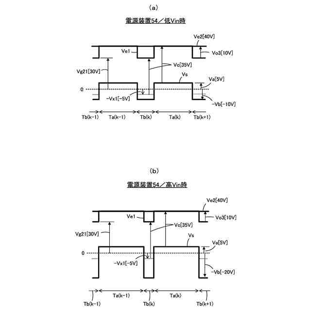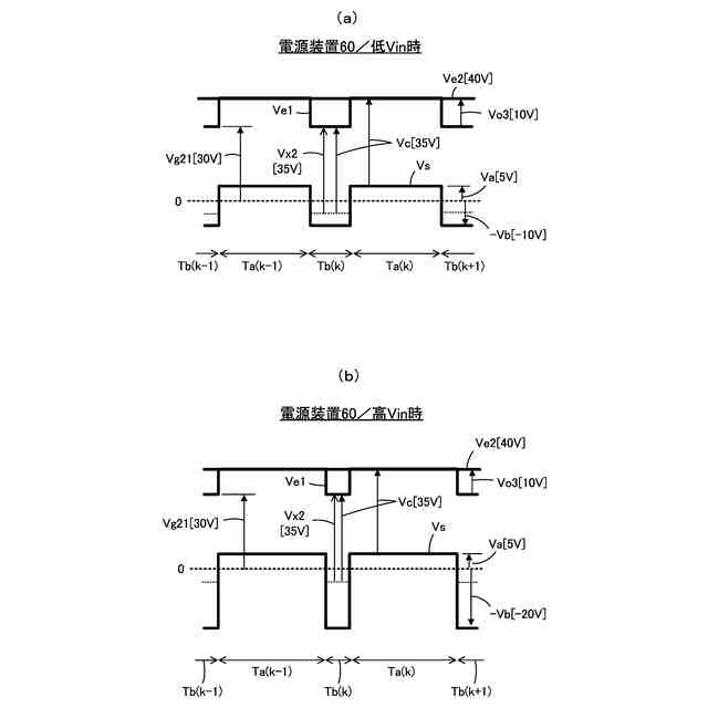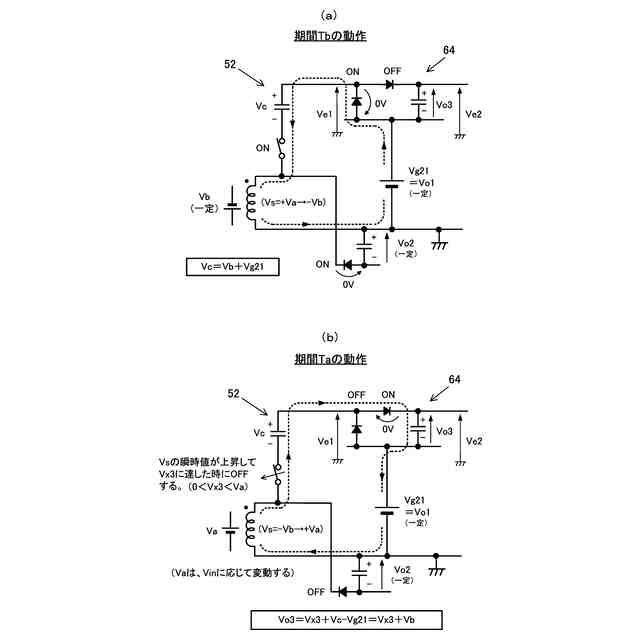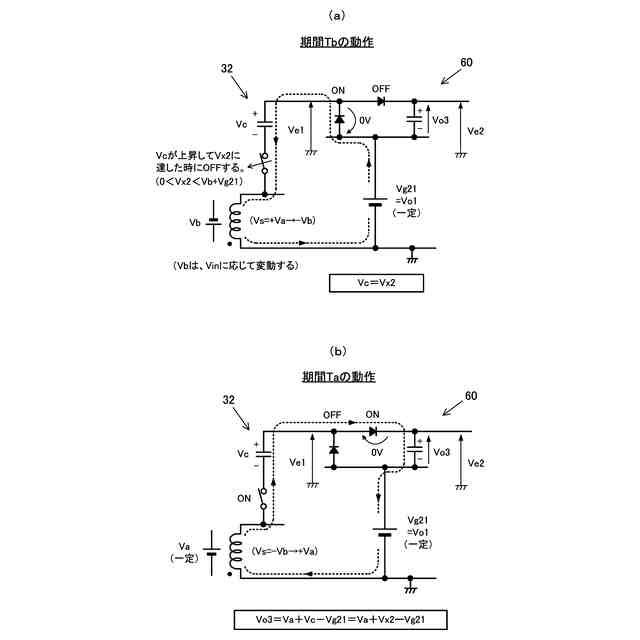 整流平滑回路30は、ダイオード30aとコンデンサ30bとで構成され、スイッチング素子22がオフして矩形波電圧Vsが正方向に振幅している期間Taに、矩形波電圧Vsの正波高値+Va[Va>0]をピークホールドして出力電圧Vo2を生成する。出力電圧Vo2は、駆動回路34が動作することによって一定の値に保持されるので、正波高値+Vaは一定の値となる。反対に、スイッチング素子22がオンして矩形波電圧Vsが負方向に振幅している期間Tbに発生する負波高値-Vb[Vb>0]は、入力電圧Viに略比例して変動することになる。