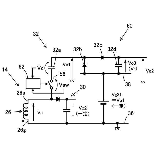 補助DC-DCコンバータ14の、トランス28を挟んで出力側の回路は、出力電圧Vo1,Vo2の基準電位となる第一のグランドライン36と、出力電圧Vo3の基準電位となる第二のグランドライン38とを有している。補助DC-DCコンバータ14の場合、第二のグランドライン38は、主DC-DCコンバータ12の出力電圧Vo1が出力されるラインであり、第一のグランドライン36に対して一定の電圧差Vg21(=Vo1)が発生している。