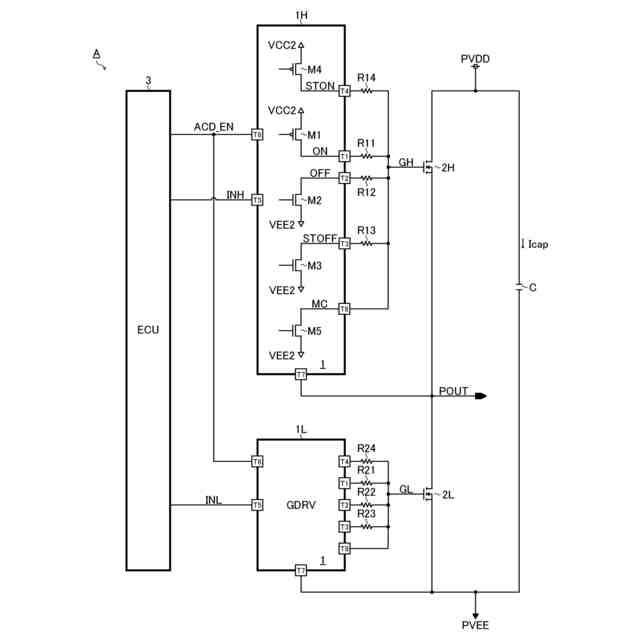 前記駆動回路は、第1電圧の印加端と第1外部端子との間を導通/遮断するように構成された第1トランジスタと、第2電圧の印加端と第2外部端子との間を導通/遮断するように構成された第2トランジスタを含み、前記アクティブディスチャージ回路は、前記第1電圧の印加端と第3外部端子との間を導通/遮断するように構成された第3トランジスタを含み、前記ミラークランプ回路は、前記第2電圧の印加端と第4外部端子との間を導通/遮断するように構成された第4トランジスタを含む、請求項1に記載の半導体装置。