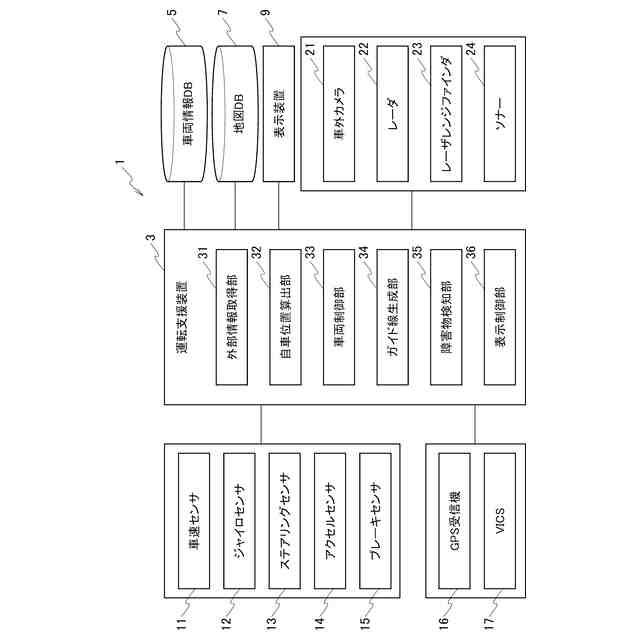 図1を参照し、本実施形態に係る運転支援装置を備えた運転支援システムの構成を説明する。図1は、本実施形態に係る運転支援システムの構成を示すブロック図である。図1に示すように、運転支援システム1は、運転支援装置3と、車両情報データベース5と、地図データベース7と、表示装置9とを備えている。