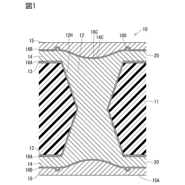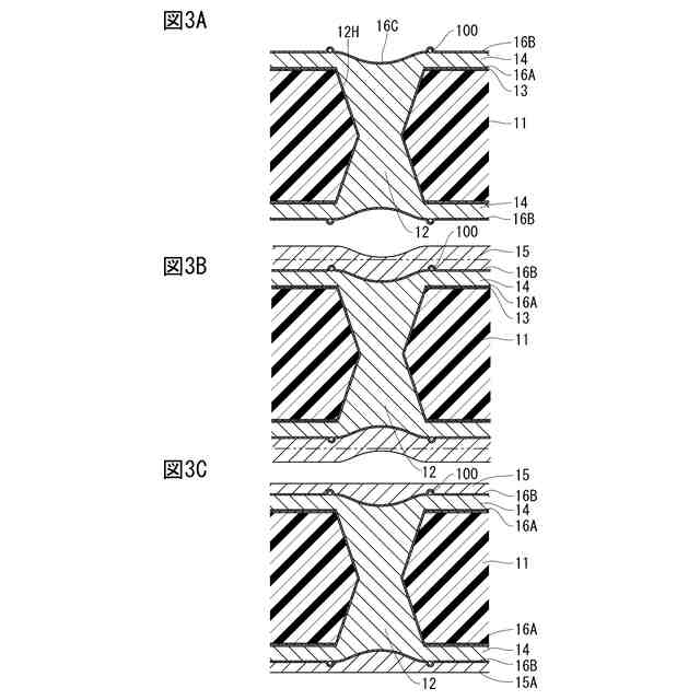 1対の導電層20は、それぞれ、銅箔13、第1及び第2の無電解めっき層16A,16B、第1及び第2の電解めっき層14,15を含む多層構造になっている。第1及び第2の無電解めっき層16A,16Bは、例えば、無電解銅めっき層であり、第1及び第2の電解めっき層14,15は、例えば、電解銅めっき層である。なお、無電解めっきは、一般に化学めっきとも呼ばれている。