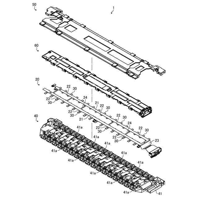 【解決手段】電池モジュールBMにおける複数の電池セルBCを電気的に接続させる複数のバスバ10と、バスバを電池監視ユニットに電気接続させるバスバ毎の回路導体を備え、かつ、可撓性を持たせて平たく形成された回路導体部品20と、バスバと回路導体部品を開口から収容する収容部材40と、収容部材に組み付けられ、かつ、開口を塞ぐカバー部材50と、を備え、回路導体部品は、バスバ毎の回路導体が配線され、かつ、収容部材の中で規定位置に収容された幹線部21と、幹線部からバスバ毎に回路導体を分岐させ、かつ、規定位置の幹線部からバスバまでの間にて弾性域内で規定形状に折り曲げて配索される分岐部22と、を有し、収容部材には、分岐部が規定形状に折り曲げられた状態で幹線部を規定位置に係止する幹線係止部42を設けること。