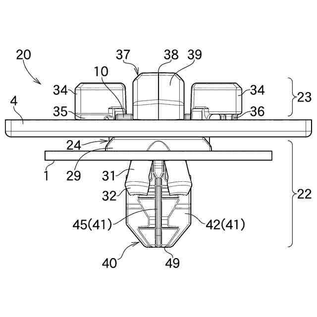 文献公知1発明に係るクリップは、二枚のパネルの間に介在するものであり、一方のパネルの孔に挿入される入れ込み部と、他方のパネルの孔に挿入される留め付け部とを有している。はじめに、入れ込み部が一方のパネルに取り付けられ、この状態で、他方のパネルが留め付け部に取り付けられる。具体的には、文献公知1発明に係るクリップは、樹脂製であり、入れ込み部は、一方のパネルの孔よりも僅かに大きな弾性片を有している。弾性片は、孔に通される際、僅かに弾性変形し、孔を通過した後に復元することで、孔の縁に係止する。