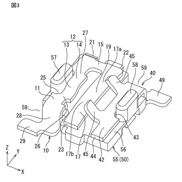 【解決手段】可動端子は、保持部材で保持される可動基部と、可動基部に連なる弾性変形部と、弾性変形部に連なる連結部と、連結部に連なる可動接触部と、を有し、固定端子は、保持部材で保持される固定基部と、固定基部に連なる固定接触部と、を有し、可動接触部は、高さ方向に弾性的に変位することによって固定接触部に対して離接動作を行うとともに長手方向に弾性的に伸縮するように構成され、弾性変形部は、長手方向に弾性的に伸縮するように構成されている。