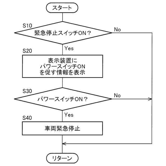 前記第1の発明によれば、走行中に前記緊急停止スイッチが操作された場合は、前記表示装置に前記パワースイッチの操作を促す情報が表示され、前記パワースイッチの操作を促す情報の表示後に前記パワースイッチが操作された場合は、前記車両を緊急停止させる制御が行われる。これにより、運転者が、緊急停止操作を、異常時の慌てた状態でも誤操作を防止しながら、よりわかり易く簡単に行うことができる。