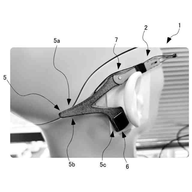 一般に、音は、空気の振動として、耳の穴から入って鼓膜を振動させ、内耳(聴覚神経)に伝わることで、人間に聞こえる。このような音の伝導は、「空気伝導」と呼ばれ、空気の振動で伝えられる音は、「気導音」と呼ばれる。「空気伝導」に対し、「骨伝導」は、頭の骨の振動を通じて、鼓膜を介さずに、直接音を聴覚神経に伝えるものである。骨伝導を利用したヘッドホン・イヤホン等の音響機器は、空気伝導のみを利用した音響機器と異なり、ユーザーの耳を開放して置くことも可能である。例えば、AR(Augmented Reality)グラスのような外出先での使用を主とした製品に骨伝導を利用した場合、ユーザーは、環境音も認識できるため、外出先での使用を主とした製品において、骨伝導は、好ましい音伝達方式である。特許文献1には、骨伝導を用いた眼鏡型のウェアラブルデバイスの発明が開示されている。