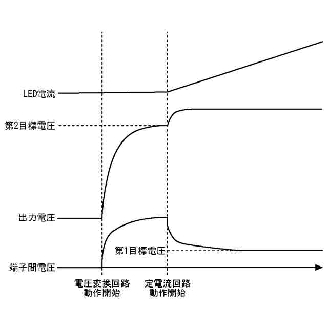 一方、照明装置では、高調波の規定または高力率によるメリットの観点から、コンバータをPFC(Power Factor Correction)動作させて力率改善を行う場合が多い。コンバータをPFC動作させるためには、コンバータの応答を十分に遅くする必要がある。このように応答を遅くした場合には特に、定電流回路の起動タイミングでコンバータの出力電圧が安定していないことにより、LEDがフラッシュするように見えてしまうおそれがあった。