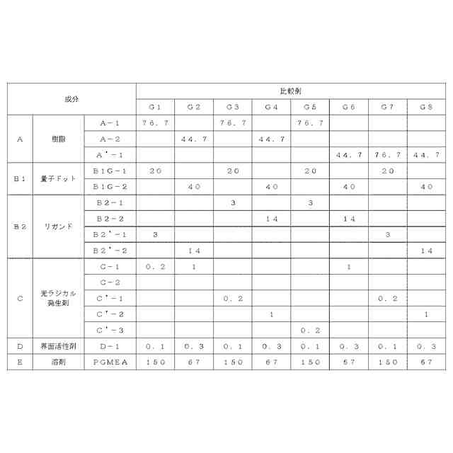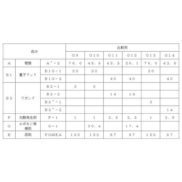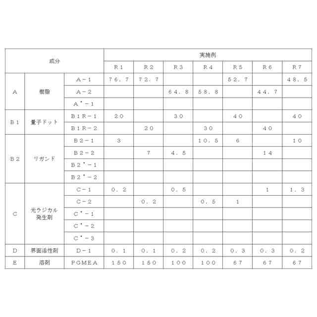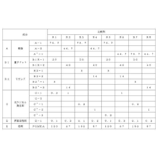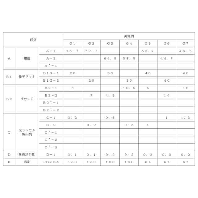 また、前記(B1)成分は、コアおよび該コアを覆ったシェルを含むコア-シェル構造を有し、前記コアは、In、P、Zn、Ga、Cd、Se、S、Te、Pb、Ag、Hg、N、AsおよびOのうちの2種以上の組み合わせからなる化合物の1種以上を含み、前記シェルは、In、P、Zn、Ga、Cd、Se、S、Te、Pb、Hg、N、As、O、MnおよびSrのうちの2種以上の組み合わせからなる化合物の1種以上を含むことが好ましい。