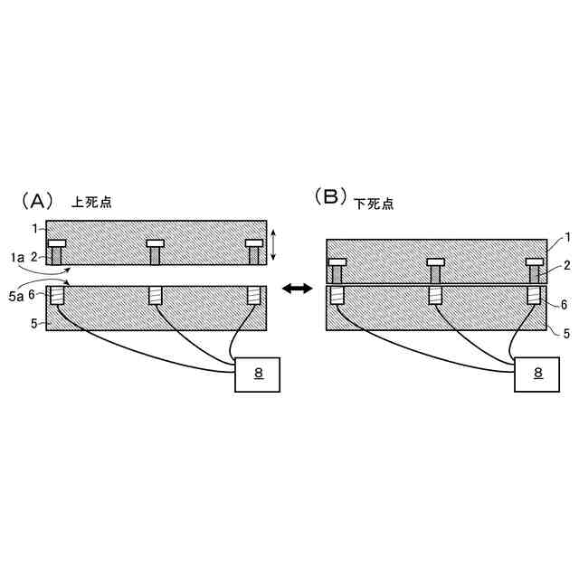 モータコアのためのコアシートのプレス打ち抜き加工に於いては、高い寸法精度と高い生産性とが得られることが好ましい。特に、プレス装置に於いて、コアシートとなる電磁鋼板を挟むパンチプレートの面とダイスプレートの面との、それらが平行である状態からの傾き(ずれ)の度合が大きくなると、積層されたコアシートをカシメ締結したときに、シート間に剥がれが生ずる可能性が高くなるので、パンチプレートの面とダイスプレートの面との平行からのずれが許容範囲内であることを、適時、好ましくは、随時、容易に確認できることが好ましい。この点に関し、従前では、図4に描かれている如く、パンチプレートの面10とダイスプレートの面12のそれぞれの両縁にエンドブロック14が互いに対向するように設けられ、プレス毎に、パンチプレートの面とダイスプレートの面とが近接する下死点でエンドブロックが同時に接触することでパンチプレートとダイスプレートとの面の平行状態が確認されていたところ、下死点で、パンチプレートが撓んだり(w)、エンドブロックが繰り返しの接触(f)により磨耗することで、平行状態を精度よく確認することが困難となる場合があり、また、電磁鋼板の板厚のばらつきに応じてエンドブロックの高さを調整する必要があるなどの煩わしさがあった。