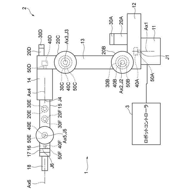 ロボット2は、シリアルリンク型であり、少なくとも、関節軸において互いに連結された一対のリンクを有する。例えばロボット2は、垂直多関節ロボットであり、リンク11,12,13,14,15,16,17と、エンドエフェクタ18と、モータ20A,20B,20C,20D,20E,20Fと、モータ回転センサ30A,30B,30C,30D,30E,30Fと、回転センサ40A,40B,40C,40D,40E,40Fとを有する。