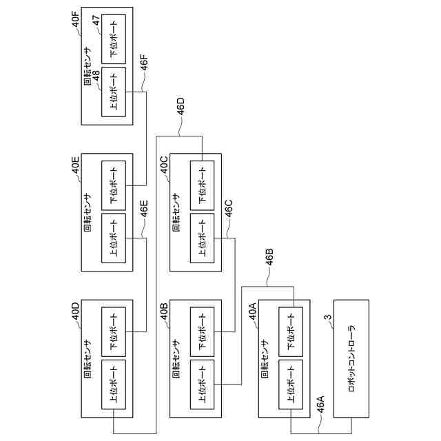 ロボットコントローラに対する回転センサの接続を例示する模式図である。