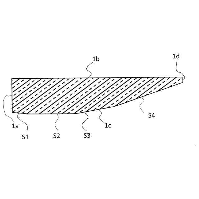 特許文献1は、入力結合要素が、導光層に結合される光の入力結合角度を最適化するために、くさび形又は台形の断面を有し、光学プリズムとして作用することを記載している。しかし、LEDなどの一般的に使用される光源は、光を多方向に放射するため、断面がくさび形(三角形)や台形のプリズムでは、導光層(内側ガラス)に入光する光を、入射角一定の平行光とすることはできない。
