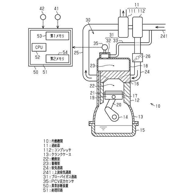 図1は、異常診断装置50を備える内燃機関10を示している。内燃機関10は排気駆動式の過給器11を備えている。内燃機関10のシリンダブロック12の下部にはクランクケース13が取り付けられている。クランクケース13内にはクランク軸14が収容されている。クランクケース13の下部には、内燃機関10内を循環するオイルが貯留されるオイルパン15が取り付けられている。