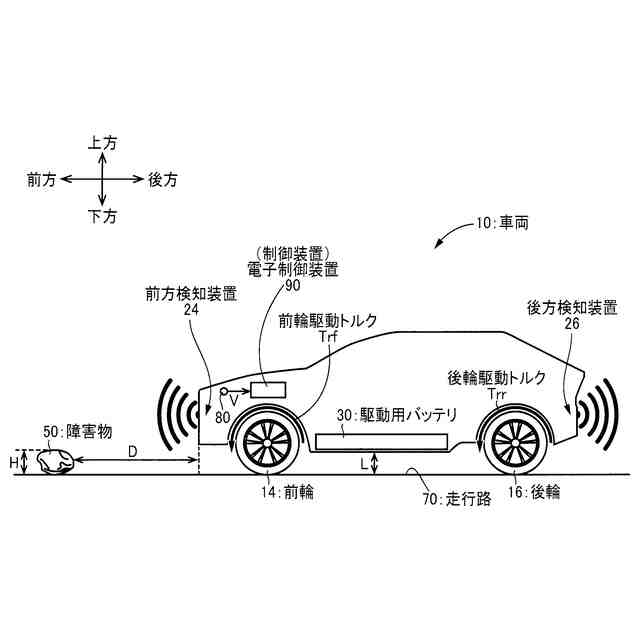 【解決手段】車両10は、前方にある障害物50を検知するとともに、前輪駆動トルクTrfと後輪駆動トルクTrrとの後輪側配分率Xrを制御する。電子制御装置90は、障害物50のうち乗り越え可能なものが検知された場合には、障害物50が検知されなかった場合に比較して、後輪側配分率Xrにおける後輪駆動トルクTrrの比率を増加させつつ、障害物50を乗り越えさせる。後輪側配分率Xrにおける後輪駆動トルクTrrの比率が増加させられることで車両10は後傾姿勢になりやすくなる。これにより、車両10は障害物50を乗り越えやすくなる。