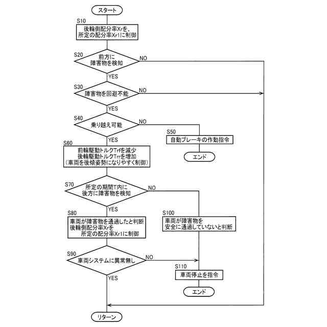 前記障害物のうち乗り越え可能なものが検知された場合には、前記障害物が検知されなかった場合に比較して、前記トルク配分における前記後輪の駆動トルクの比率を増加させつつ、前記障害物を乗り越えさせる