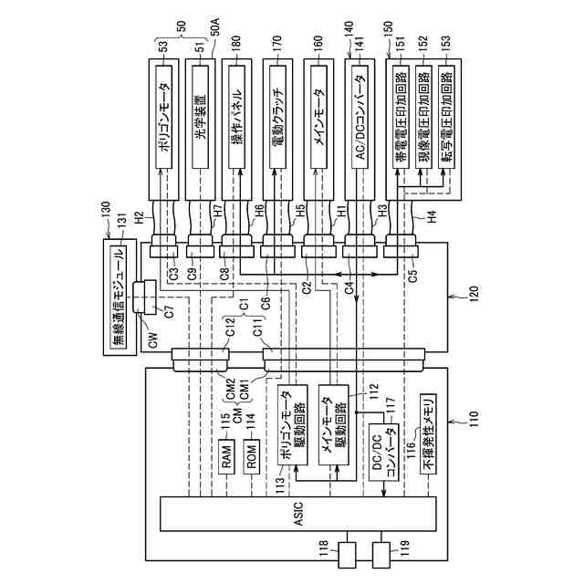 【解決手段】画像形成装置は、メインモータ160と、本体筐体10に着脱自在なメイン基板110と、コネクタ基板120とを備える。コネクタ基板120は、第1コネクタC1と、第2コネクタC2とを有する。第1コネクタC1には、メイン基板110がハーネスを介さずに直接接続されている。第2コネクタC2には、メインモータ160を接続する第1ハーネスH1の端子が接続されている。ASIC111は、第1コネクタC1および第2コネクタC2を介して、メインモータ160に制御信号を送信する。