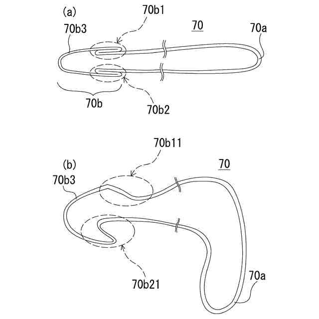 前記留め部が、前記ラインの他端のうち前記収容器内部から前記収容器外部に突出している部分の少なくとも一部を縫製または接着によって仮留めしてなるものであって、