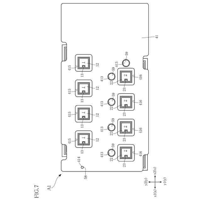 図1~図13は、第1実施形態にかかる半導体装置A1を示している。半導体装置A1は、複数の第1半導体素子1、複数の第2半導体素子2、支持部材3、複数の絶縁基板41、複数の配線部511~514,521~523,531~533,541~543,551~553,561,571,572、複数の金属部材58,59、一対の制御端子61,62、複数の検出端子63~65、複数の接続部材7、および、封止部材8を備えている。複数の接続部材7は、図3および図4に示すように、複数の接続部材711,712,721~723,731~733,741~743,751~753を含む。