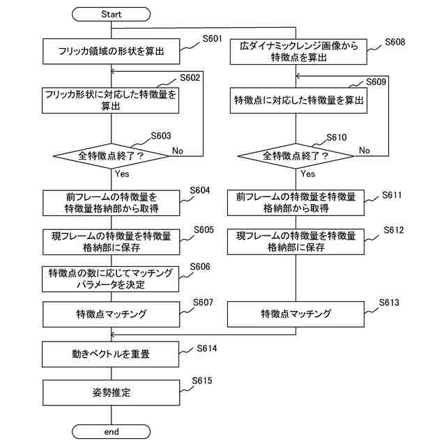 しかしながら、特許文献1に記載された方法の場合は、フリッカの発生している画素領域の形状を取得することができない。フリッカの発生している画素領域の形状を取得することで、形状情報を用いた特徴点マッチングによる姿勢推定に用いることができる。一般的に形状の抽出には、Canny法が用いられるが、形状ととらえる画素値の勾配の閾値の設定が一意に決まらないため、精度が低くなる課題がある。