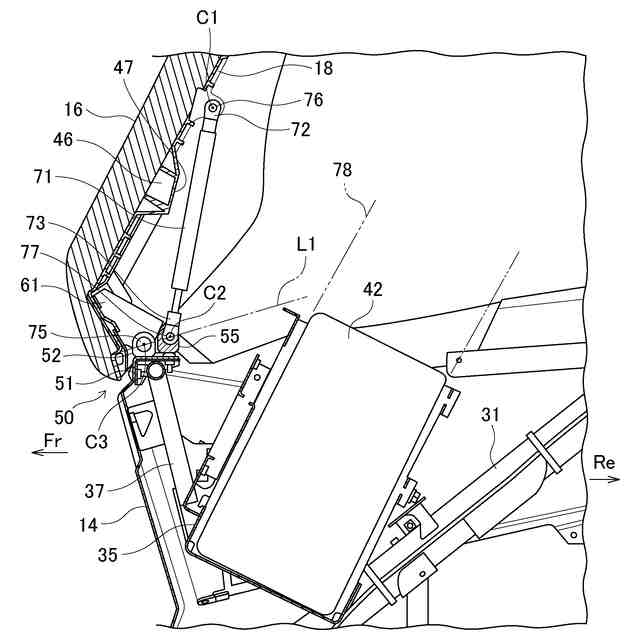 鞍乗型車両のシートの開閉機構として、ダンパーによってシートの持ち上げ操作が補助されるものが知られている(例えば、特許文献1参照)。特許文献1に記載のシートの開閉機構では、シートの前端部に設けられた可動ブラケットと車体フレームに設けられた固定ブラケットがヒンジを介して開閉可能に連結されている。シートの前後方向の中間部にはダンパーが連結されており、シートが閉じた状態でダンパーの反発力がシートに対して開く方向に作用している。このため、運転者が上向きに軽く力を加えるだけでシートが開かれ、ダンパーの反発力によってシートが開いた状態で保持される。
