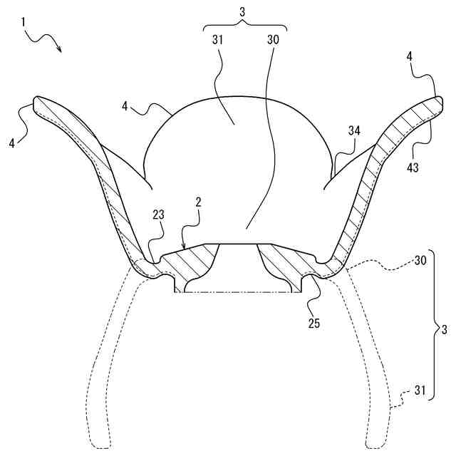 特許文献1には、イヤーピースが開示されている。このイヤーピースは、柱状の中央支柱部と、中央支柱部を覆う傘状部を有する。傘状部は第一部品および第二部品を有し、第一部品の硬度が第一硬度であり、第二部品の硬度が第一硬度よりも小さい第二硬度である。傘状部は、第一部品の上端が中央支柱部の頂端と連接し、第一部品の下端及び第二部品の上端が重なって切り替え区域を形成し、切り替え区域において第一部品の厚みが上部から下部にかけて徐々に減少しかつ第二部品の厚みが上部から下部にかけて徐々に増加している。傘状部は、切り替え区域の幅が傘状部の厚みの二倍から三倍である。