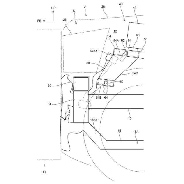 以下、図面を用いて、本実施の形態に係る車両前部構造Sが適用された車両(自動車)Vについて説明する。なお、図面では、車両Vの車両前側を矢印FRで示し、車両上側を矢印UPで示し、車両上側から見たときの車両左側(車幅方向一方側)を矢印LHで示している。また、以下の説明において、上下、前後、左右の方向を用いて説明するときには、特に断りのない限り、車両上下方向、車両前後方向、車両左右方向を示すものとする。