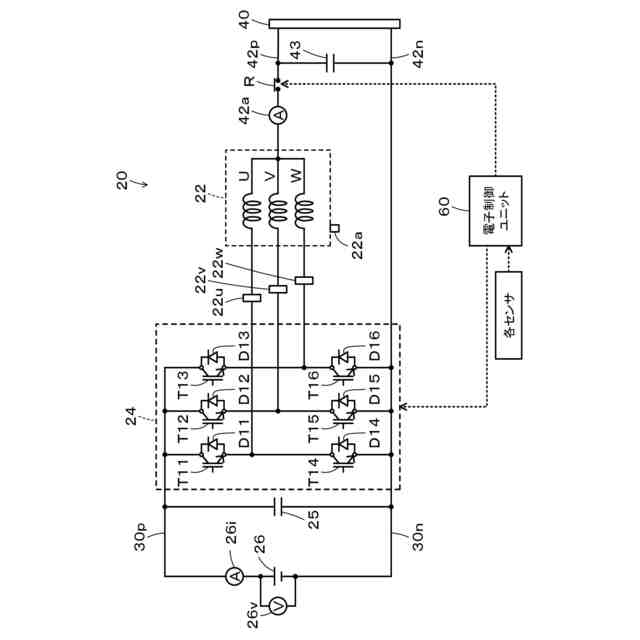 モータ22は、回転子コアに永久磁石が埋め込まれた回転子と、固定子コアに三相(U相、V相、W相)コイルが巻回された固定子と、を有する三相交流電動機として構成されている。インバータ24は、6つのトランジスタT11~T16と、6つのトランジスタT11~T16に各々に並列に接続された6つのダイオードD11~D13とを備える。トランジスタT11~T16は、バッテリ26が接続された正極ライン30pおよび負極ライン30nに対してソース側およびシンク側となるように2個ずつペアで配置されている。トランジスタT11~T16の対となる2つのトランジスタの接続点の各々は、モータ22のU相、V相、W相コイルに各々に接続されている。コンデンサ25は、正極ライン30pおよび負極ライン30nに接続されている。バッテリ26は、例えばリチウムイオン二次電池やニッケル水素二次電池として構成されており、正極ライン30pおよび負極ライン30nを介してインバータ24に接続されている。