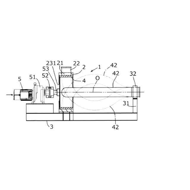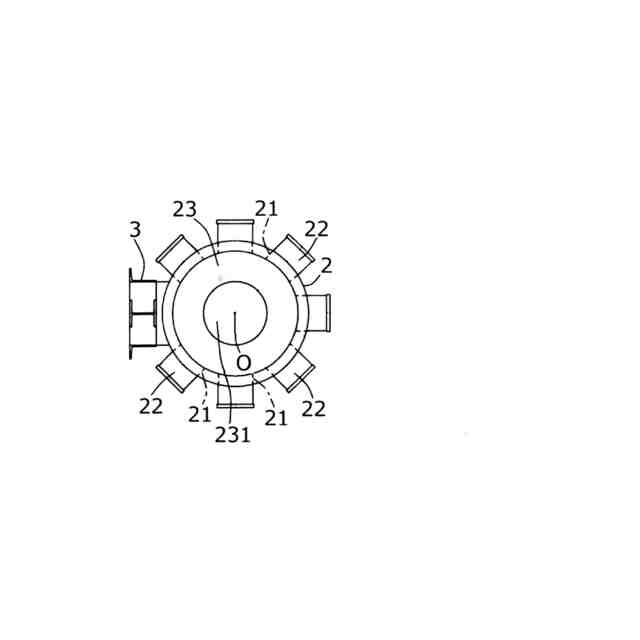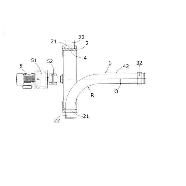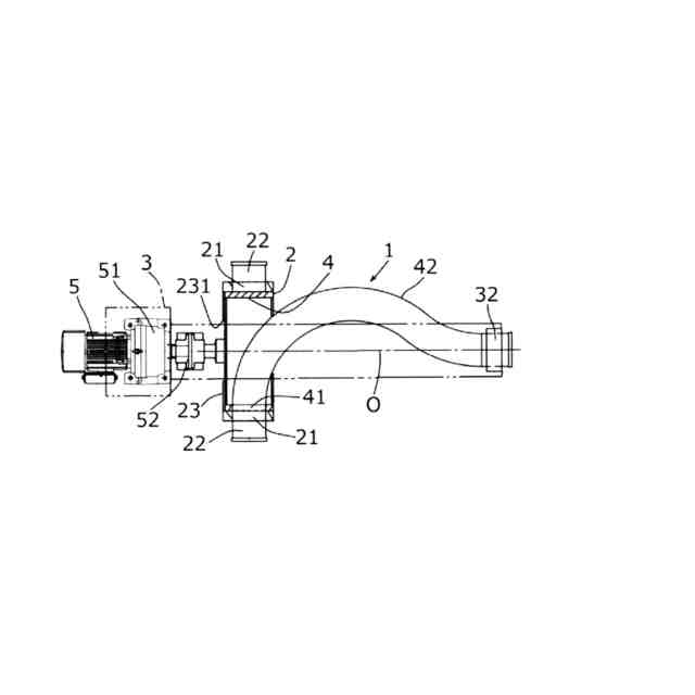 本第2発明では、前記連結パイプ(42)は、所定の曲率半径(R)で前記回転軸(O)を越えて湾曲した後、所定の曲率半径(R)で反対側へ湾曲している。